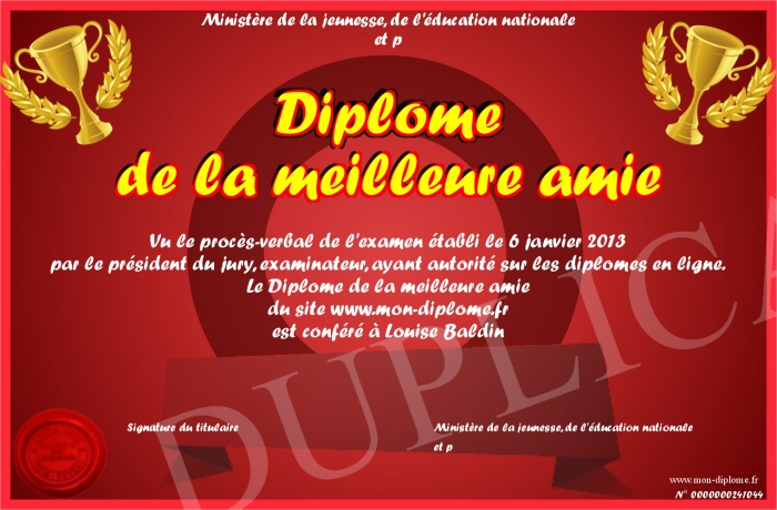 Envoyez par email votre Diplôme de la meilleure amie personalisé