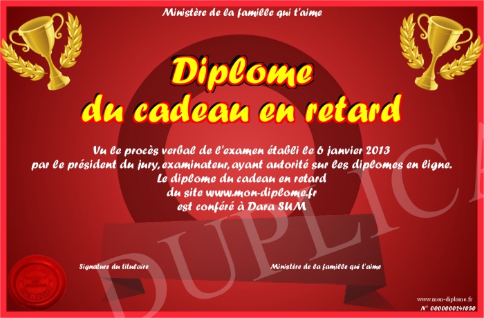 Envoyez par email votre Diplome du cadeau en retard personalisé