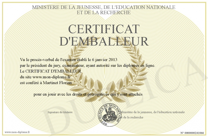Envoyez par email votre CERTIFICAT D'EMBALLEUR personalisé