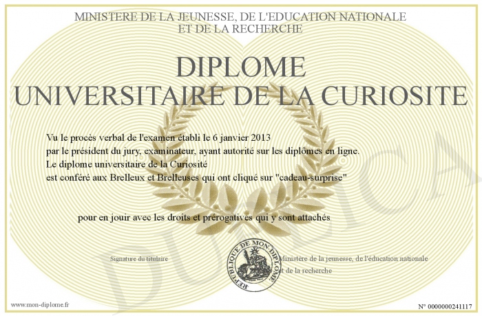 Envoyez par email votre diplôme universitaire de la Curiosité personalisé