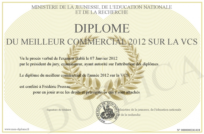 Envoyez par email votre Diplôme du meilleur commercial 2012 sur la VCS personalisé