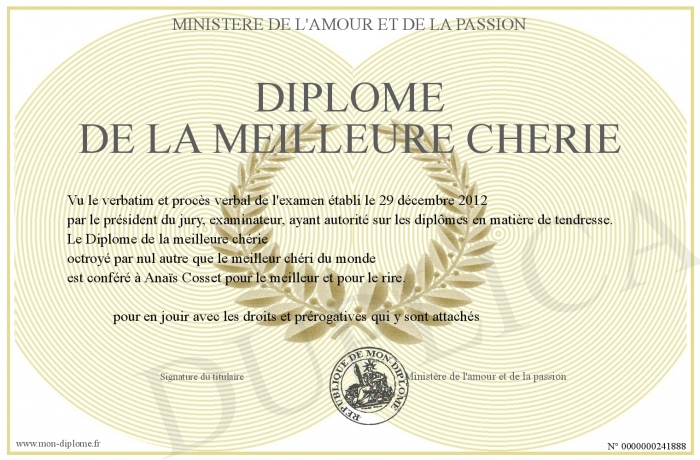 Envoyez par email votre Diplôme de la meilleure chérie personalisé