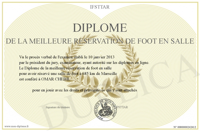 Envoyez par email votre Diplôme de la meilleure réservation de foot en salle personalisé