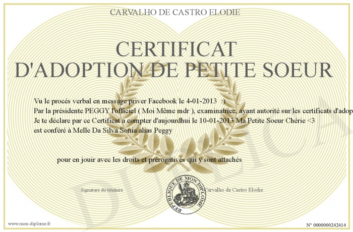 Envoyez par email votre Certificat D'adoption de petite Soeur personalisé
