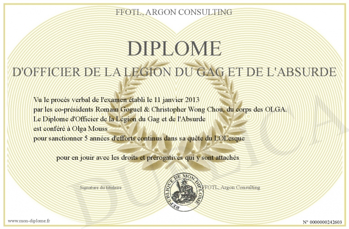 Envoyez par email votre Diplôme d'Officier de la Légion du Gag et de l'Absurde personalisé