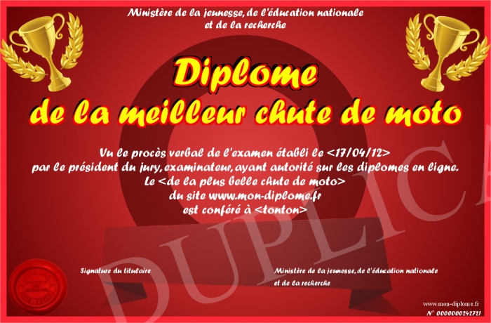 Envoyez par email votre Diplôme de la meilleur chute de moto personalisé