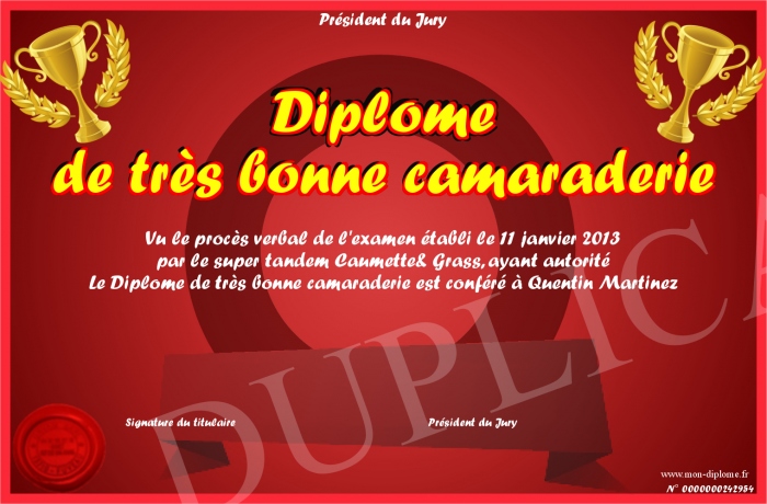 Envoyez par email votre Diplôme de très bonne camaraderie personalisé