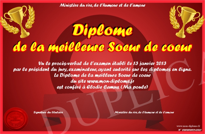Envoyez par email votre Diplome de la meilleure Soeur de coeur personalisé