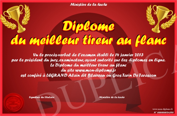 Envoyez par email votre Diplôme du meilleur tireur au flanc personalisé