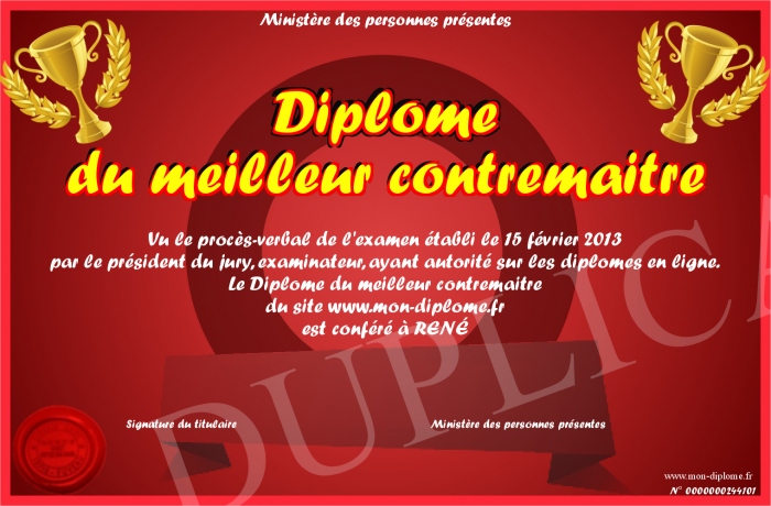 Envoyez par email votre Diplôme du meilleur contremaitre personalisé