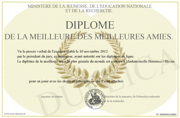 Envoyez par email votre Diplôme de la meilleure des meilleures amies. personalisé
