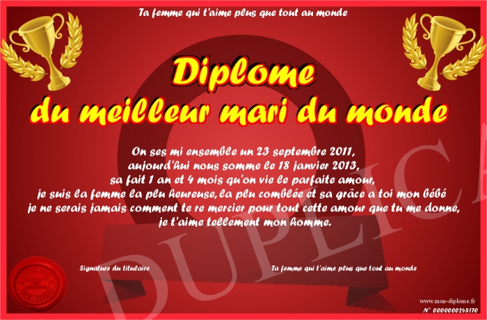 Envoyez par email votre Diplôme du meilleur mari du monde personalisé