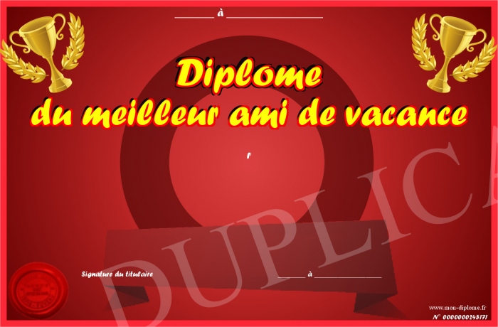 Envoyez par email votre Diplôme du meilleur ami de vacance personalisé