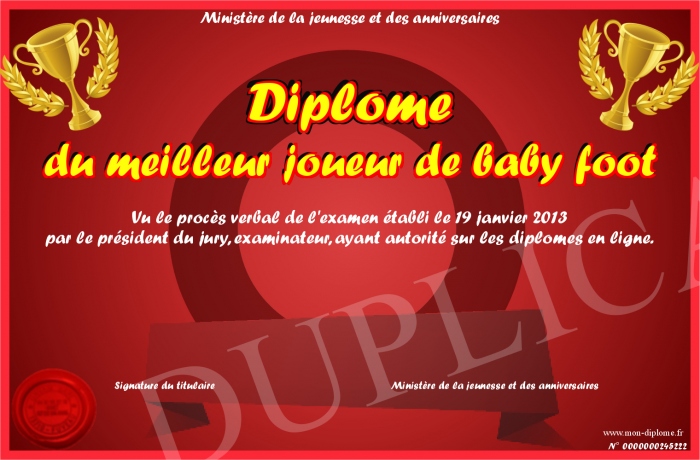 Envoyez par email votre Diplôme du meilleur joueur de baby foot personalisé