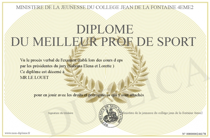 Envoyez par email votre Diplôme du meilleur prof de sport personalisé