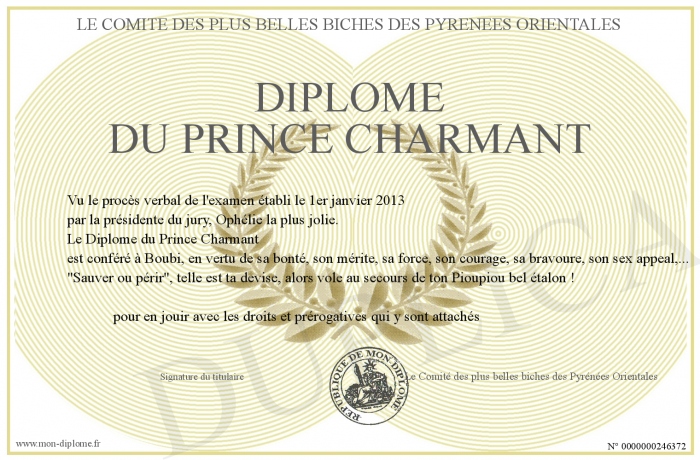Envoyez par email votre Diplôme du Prince Charmant personalisé