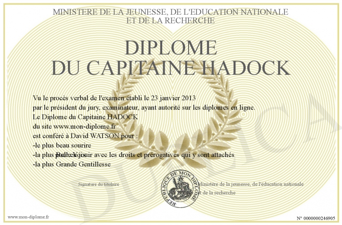 Envoyez par email votre Diplôme du Capitaine HADOCK personalisé