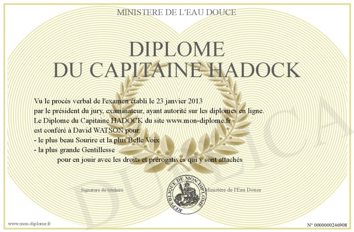 Envoyez par email votre Diplôme du Capitaine HADOCK personalisé
