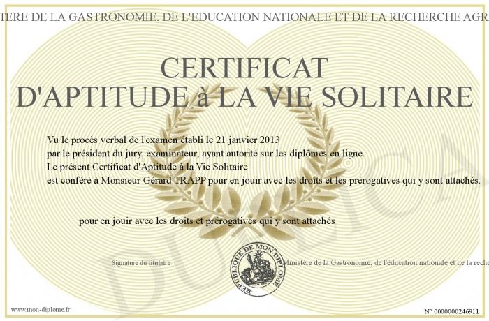 Envoyez par email votre Certificat d'Aptitude à la Vie Solitaire personalisé
