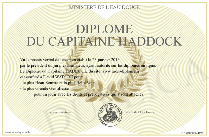 Envoyez par email votre Diplôme du Capitaine HADDOCK personalisé