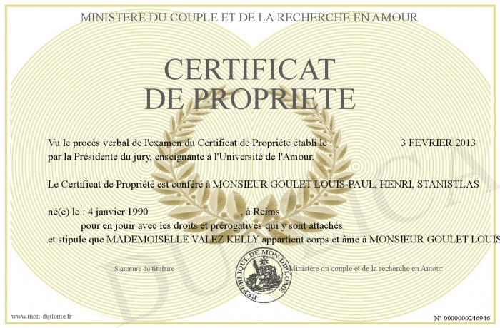 Envoyez par email votre Certificat de Propriété personalisé