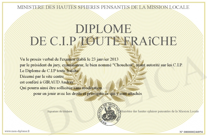 Envoyez par email votre Diplôme de C.I.P toute fraîche personalisé
