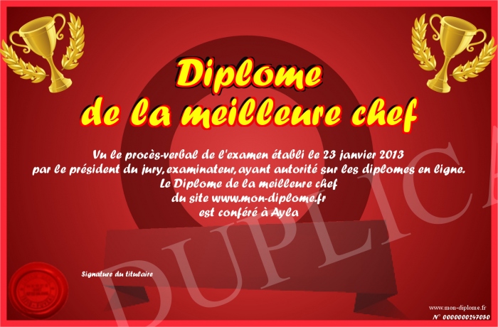 Envoyez par email votre Diplôme de la meilleure chef personalisé