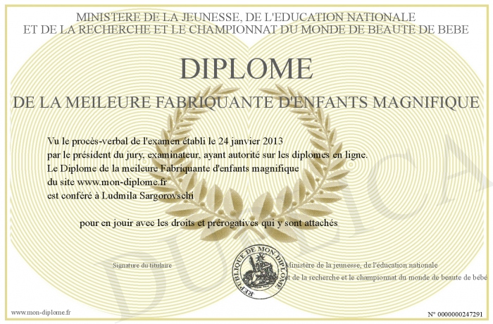 Envoyez par email votre Diplôme de la meileure Fabriquante d'enfants magnifique personalisé
