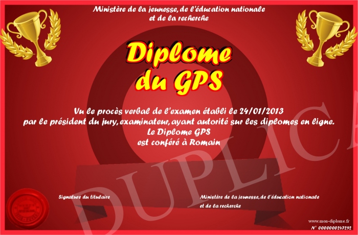 Envoyez par email votre Diplôme du GPS personalisé