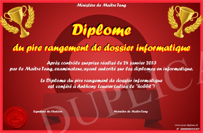 Envoyez par email votre Diplome du pire rangement de dossier informatique personalisé