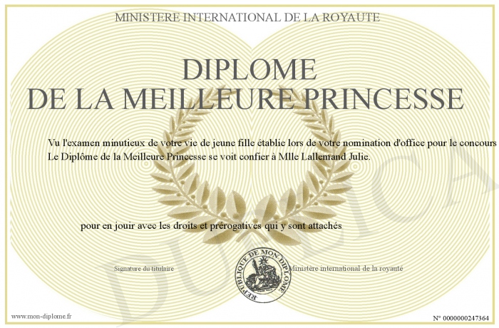 Envoyez par email votre DIPLOME DE LA MEILLEURE PRINCESSE personalisé