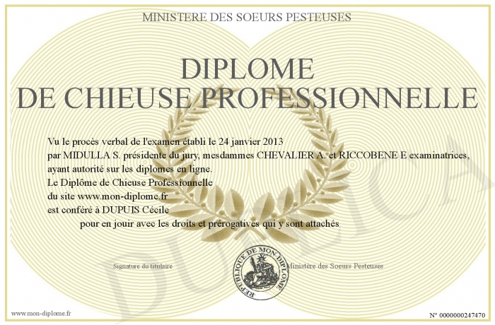 Envoyez par email votre Diplôme de Chieuse Professionnelle personalisé