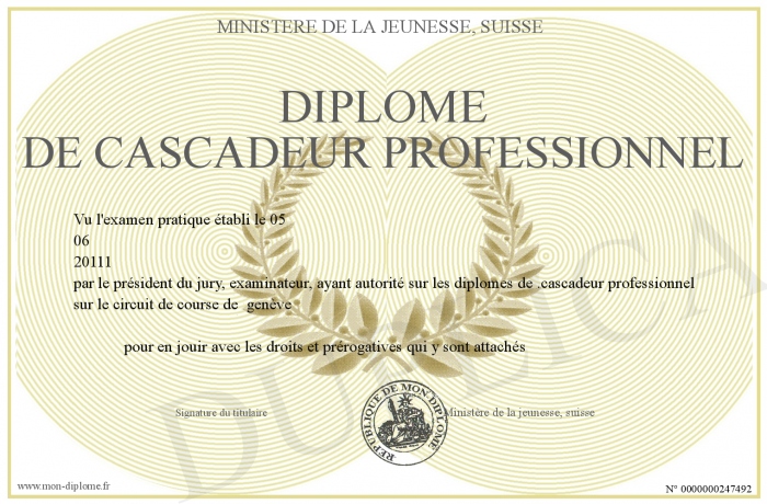 Envoyez par email votre Diplôme de cascadeur professionnel personalisé