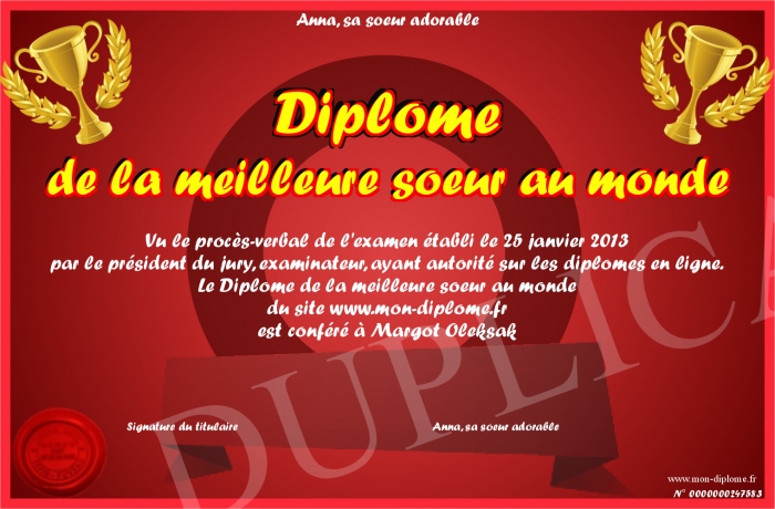 Envoyez par email votre Diplôme de la meilleure soeur au monde personalisé