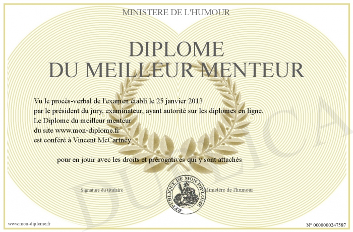 Envoyez par email votre Diplôme du meilleur menteur personalisé