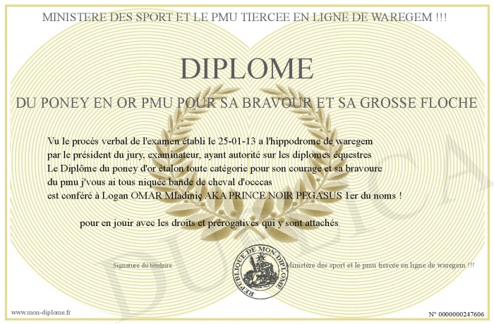 Envoyez par email votre Diplôme du Poney en or pmu pour sa bravour et sa grosse floche personalisé