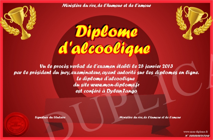 Envoyez par email votre Diplome d'alcoolique personalisé