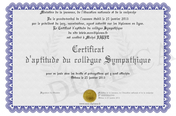 Envoyez par email votre Certificat d'aptitude du collègue Sympathique personalisé