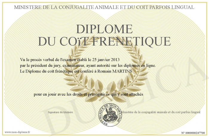 Envoyez par email votre Diplôme du coït frénétique personalisé