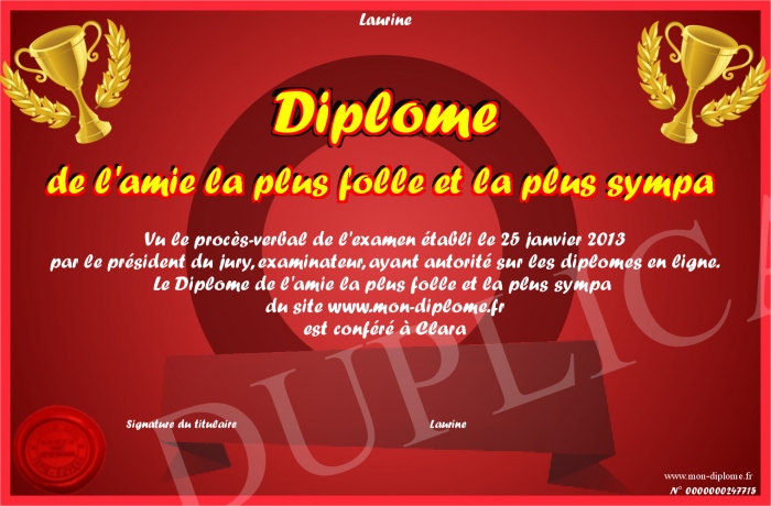 Envoyez par email votre Diplôme de l'amie la plus folle et la plus sympa personalisé
