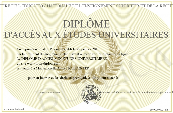 Envoyez par email votre DIPLÔME D'ACCÈS AUX ÉTUDES UNIVERSITAIRES personalisé