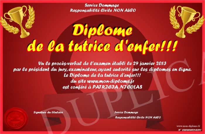 Envoyez par email votre Diplôme de la tutrice d'enfer!!! personalisé