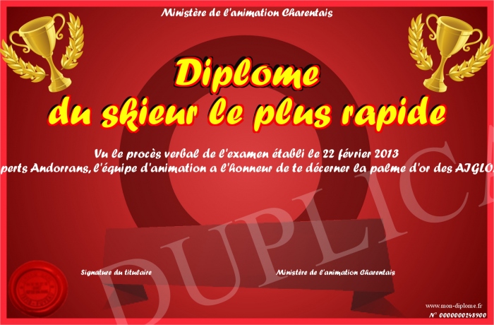 Envoyez par email votre Diplôme du skieur le plus rapide personalisé