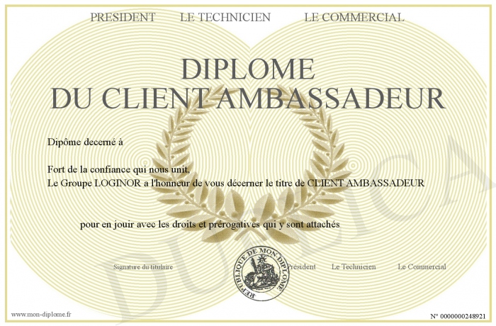 Envoyez par email votre Diplôme du Client AMBASSADEUR personalisé