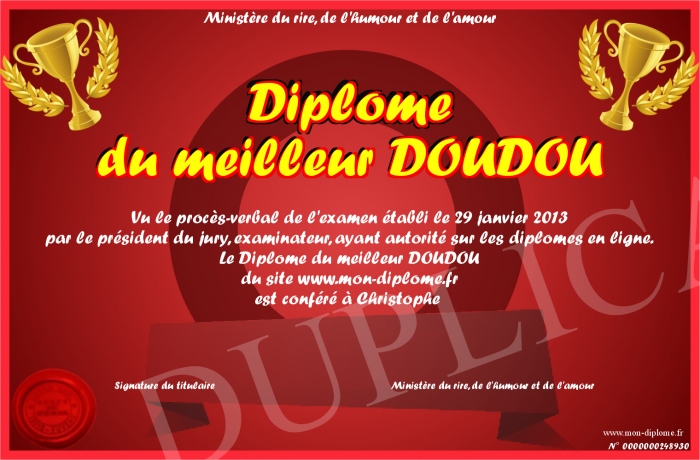 Envoyez par email votre Diplome du meilleur DOUDOU personalisé