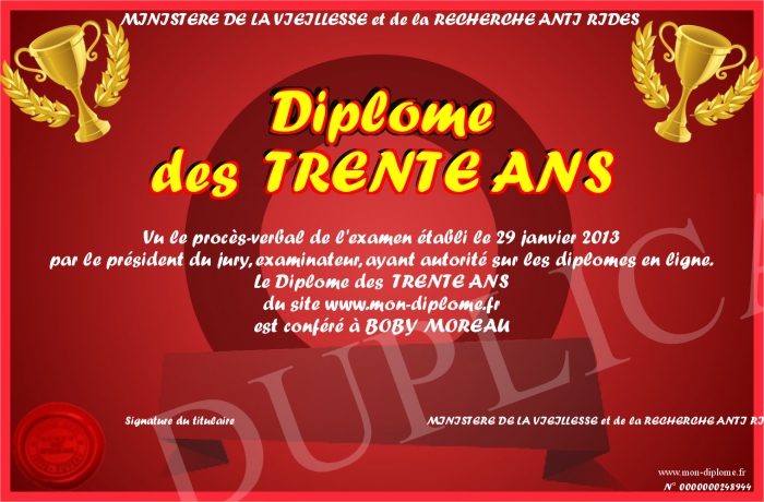 Envoyez par email votre Diplôme des TRENTE ANS personalisé