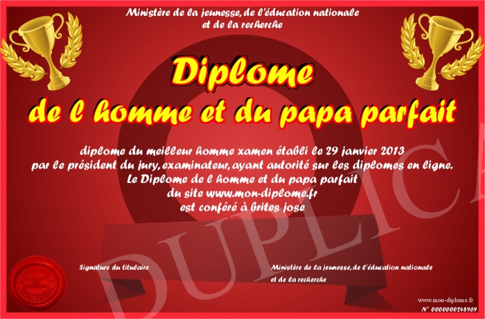 Envoyez par email votre Diplôme de l homme et du papa parfait personalisé