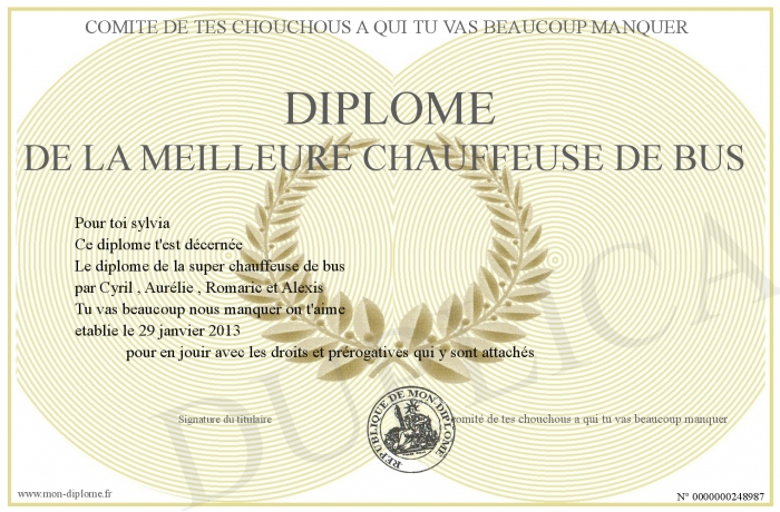 Envoyez par email votre Diplôme de la meilleure chauffeuse de bus personalisé