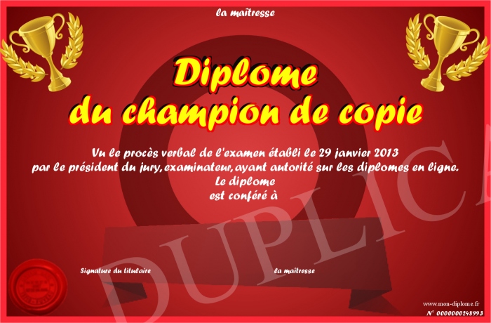 Envoyez par email votre Diplôme du champion de copie personalisé