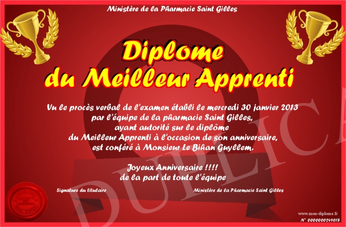 Envoyez par email votre Diplôme du Meilleur Apprenti personalisé